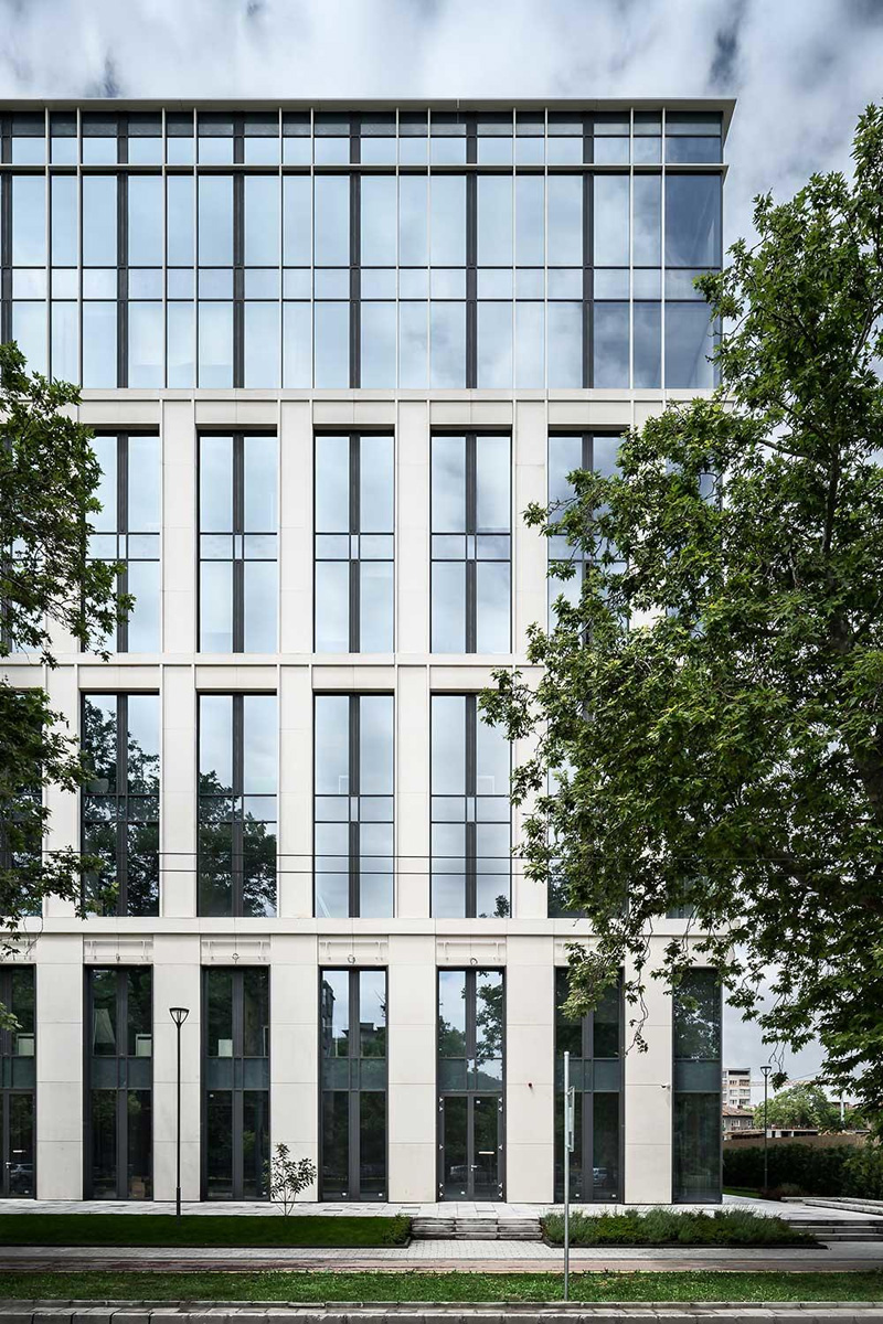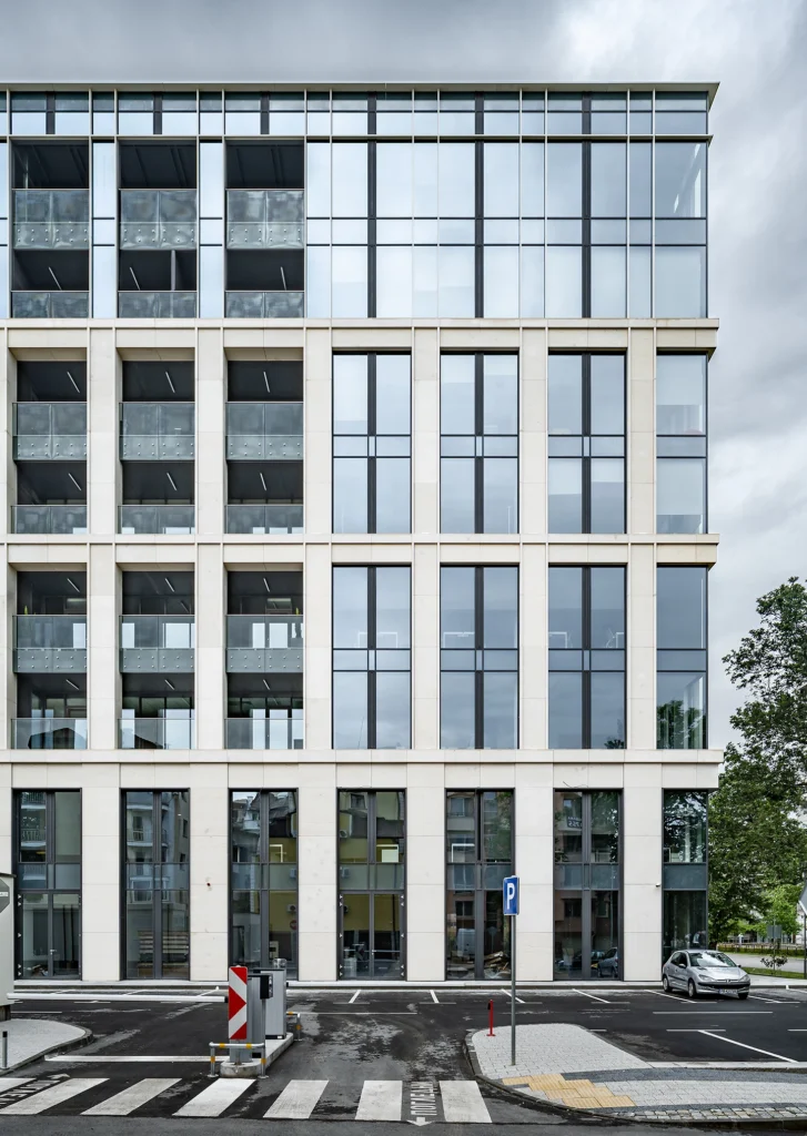 The Vision: Modernity & Sustainability The architects at SGI envisioned a dynamic corporate center that meets the highest European sustainability standards, eventually earning a BREEAM certification. The challenge was finding a facade material that could seamlessly blend with the expansive high-tech glass curtain walls while providing a solid, monumental framing that grounds the building visually.