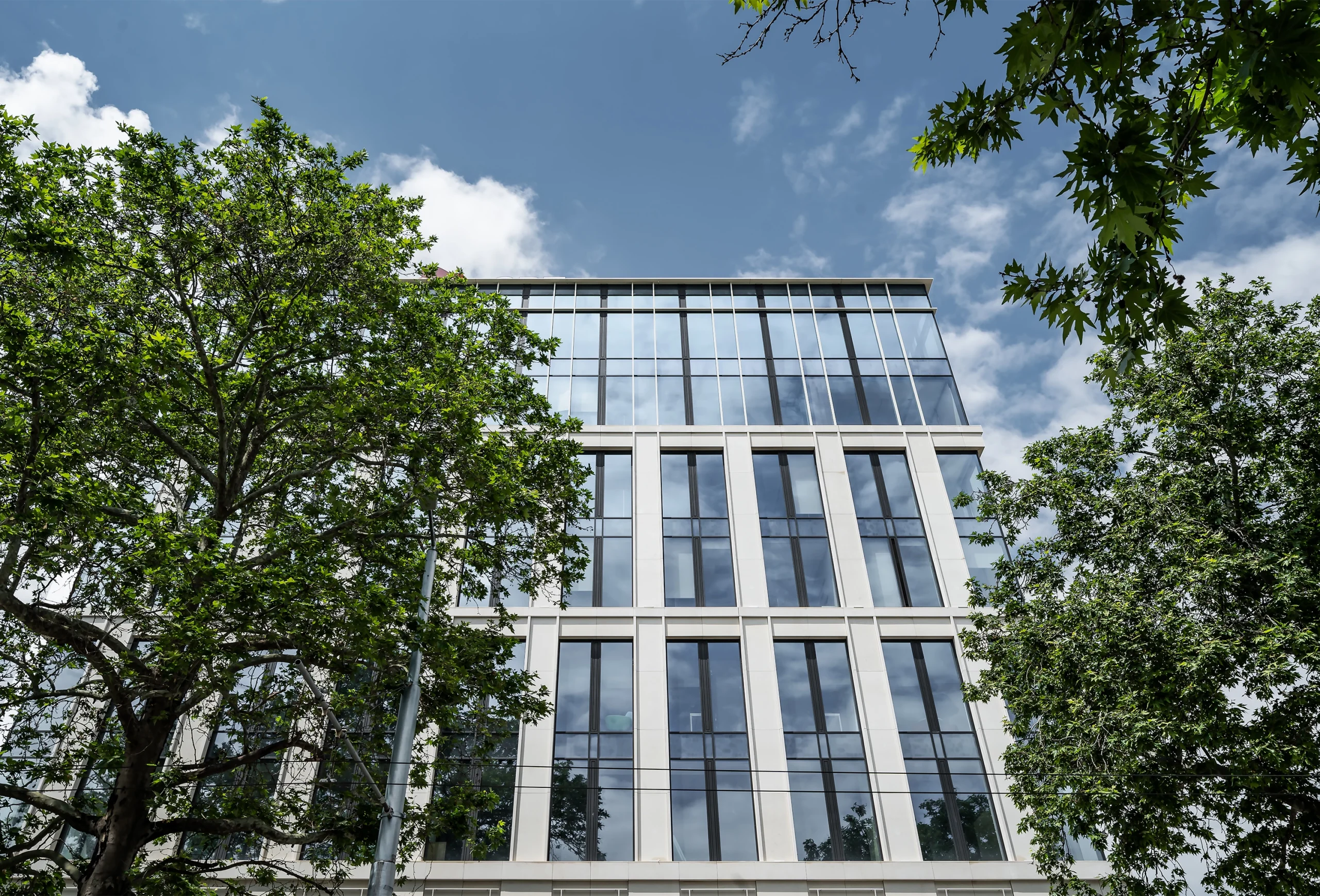 ● Architectural Contrast: The warm, matte beige tones of the limestone create a striking, organic contrast against the cold, reflective surfaces of the glass, giving the building a distinct, premium corporate identity.