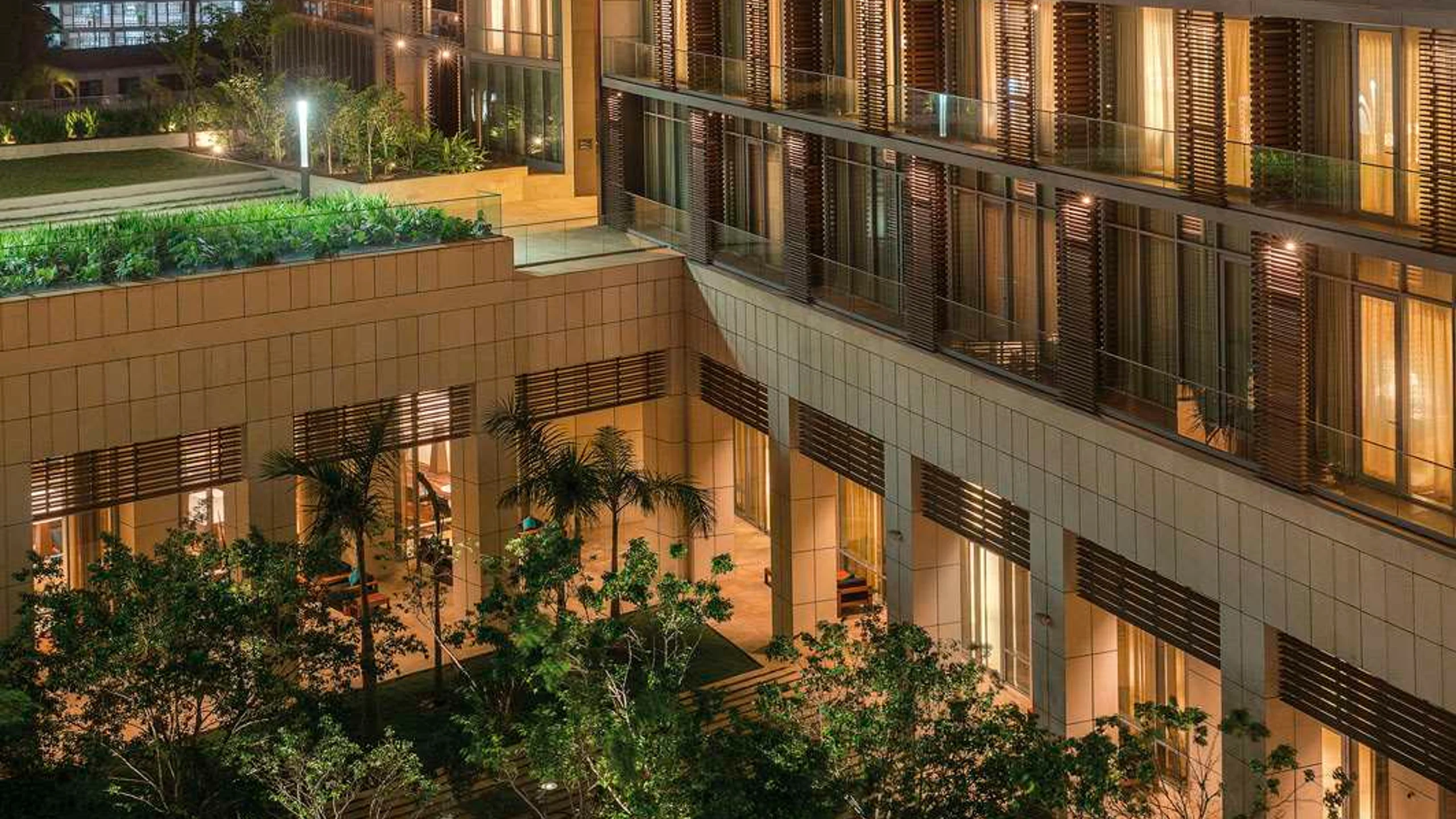 Timeless Luxury: The organic warmth of the stone perfectly complements the lush green surroundings and the iconic butterfly-shaped roof of the complex, maintaining a pristine five-star appearance year after year.