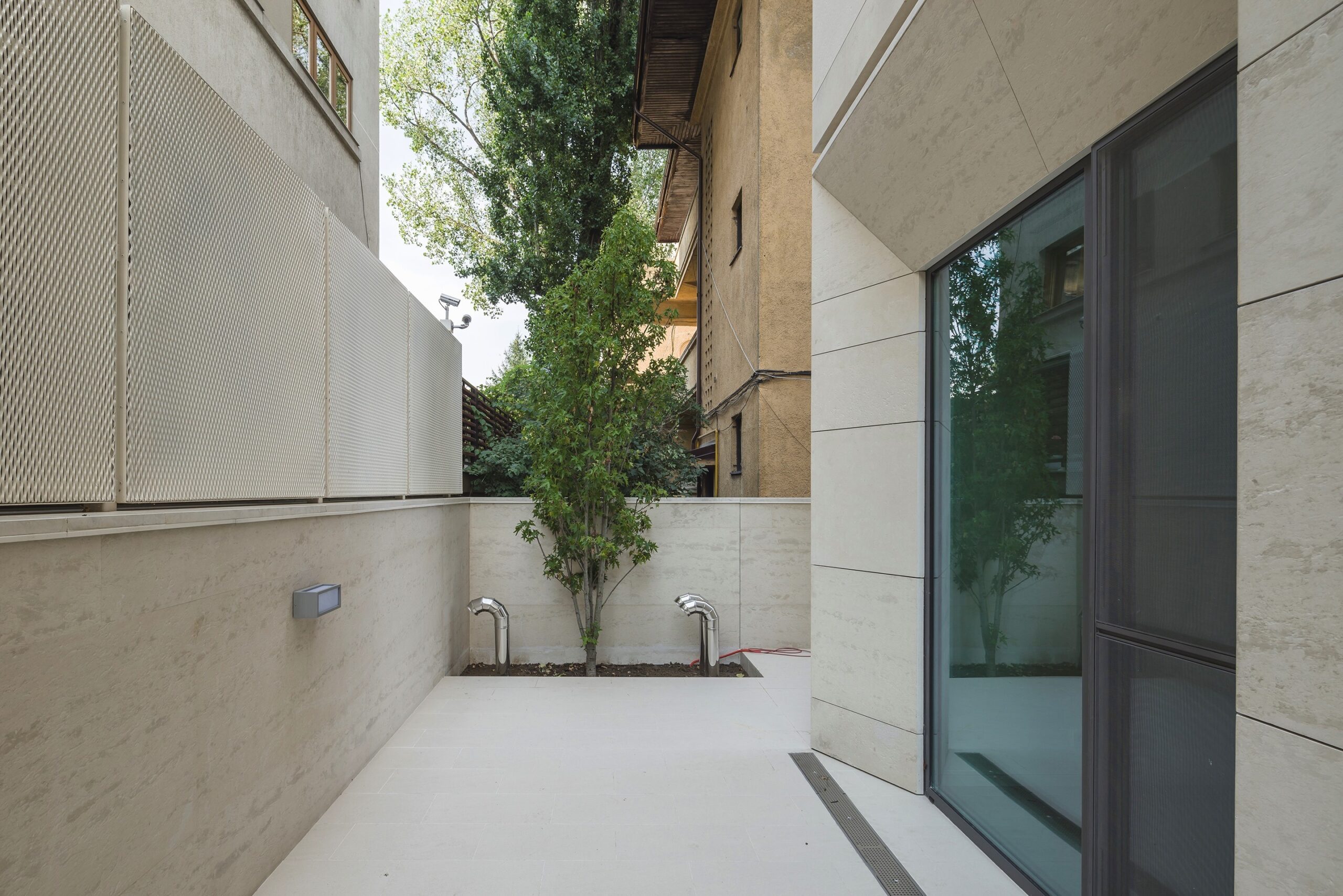 ● Luminous Aesthetics: The pale, warm beige tone of the limestone catches the sunlight beautifully, softening the strict geometric lines and adding a luxurious texture to the solid structure.