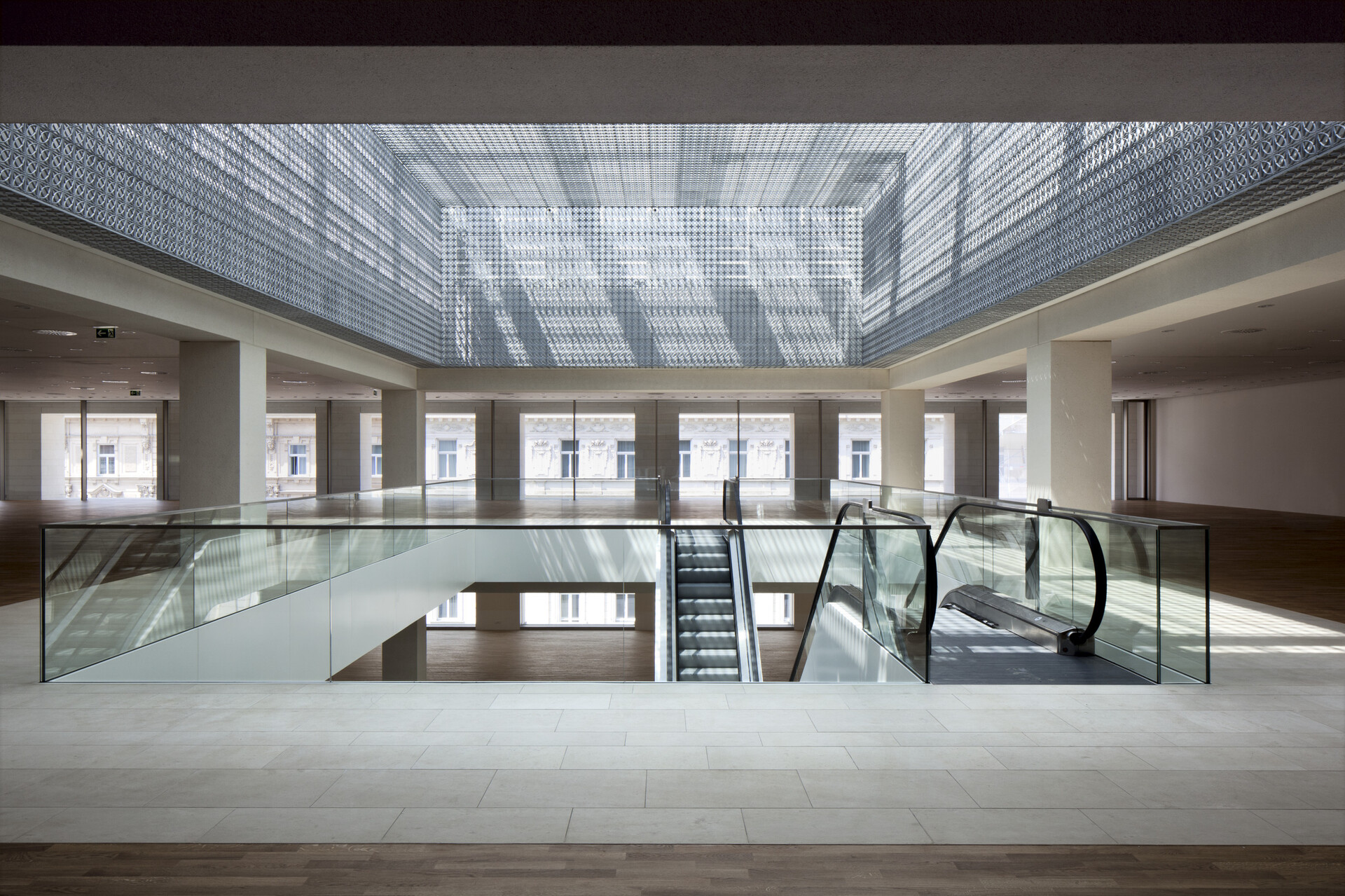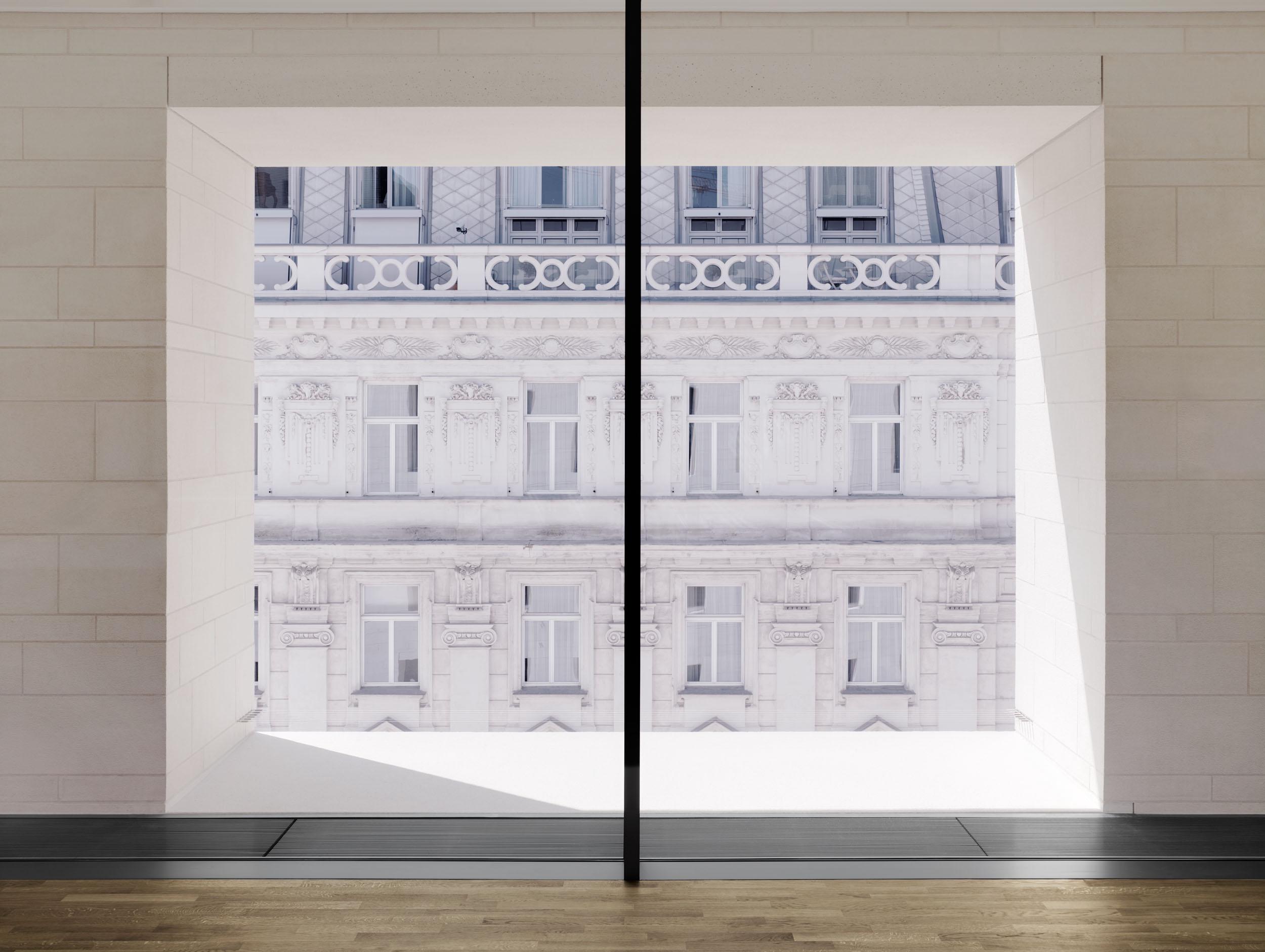 ● The Exterior Facade: The massive outer shell is constructed from bush-hammered Vratza Limestone. This textured finish provides a solid, light-colored presence that contrasts beautifully with the recessed glass windows, fulfilling the strict aesthetic demands of the Viennese historic center.